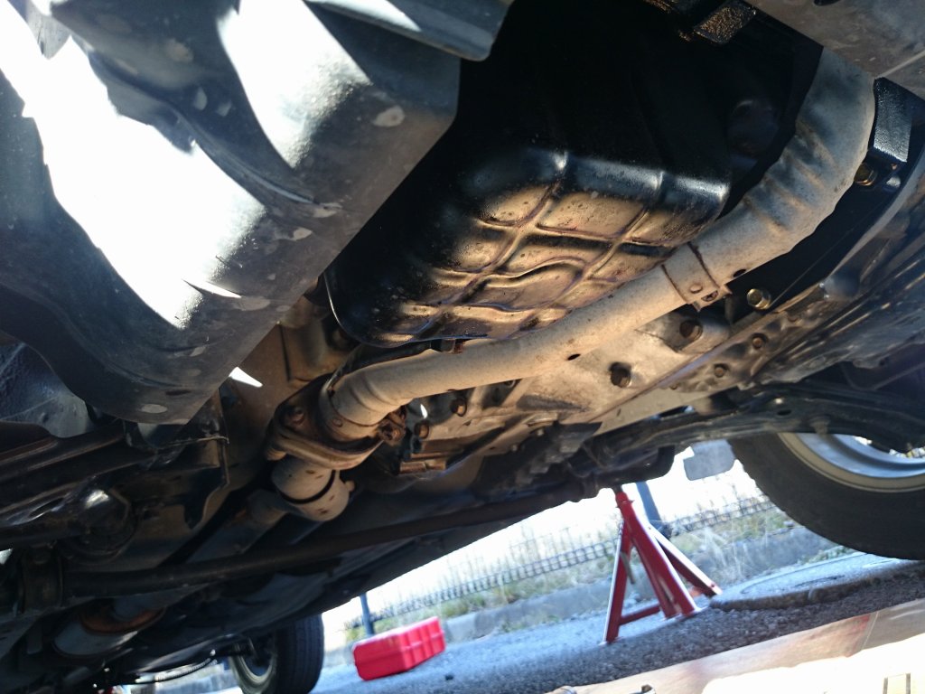 今回初めて下に潜ってみたのですが、オイルパンの回りにオイル汚れ、そしてオイルのしずくが確認できました。車検を通すときに言われていた、オイル漏れを目視確認しました。