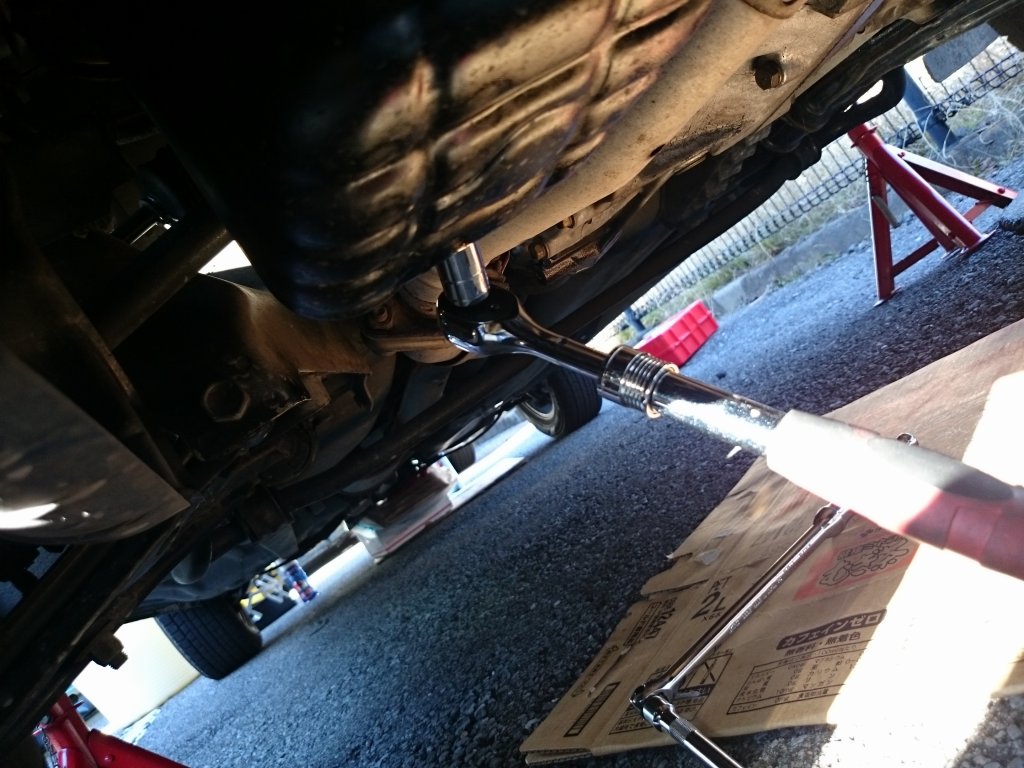 話はそれましたが、14番のボックスレンチをラチェットに装着し、ドレンボルトを緩めます。