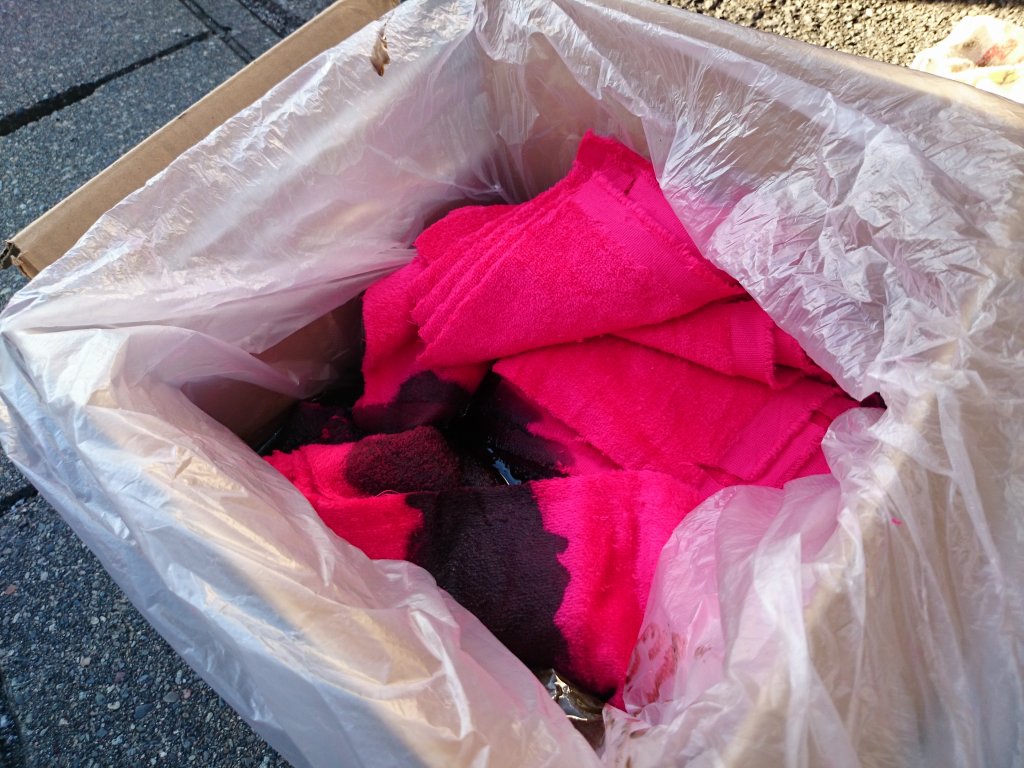 ダンボール箱にビニール袋を2重にかぶせて、その中にタオルの切れっ端をぶち込んで完成です。