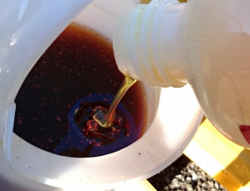 これをそのままエンジンのオイル投入口から入れたとしても、途中で引っかかってエンジン全体に行き渡る気が全くしません。ちょっと面倒ですが、このようにして別の容器で混ぜ合わせる必要があります。