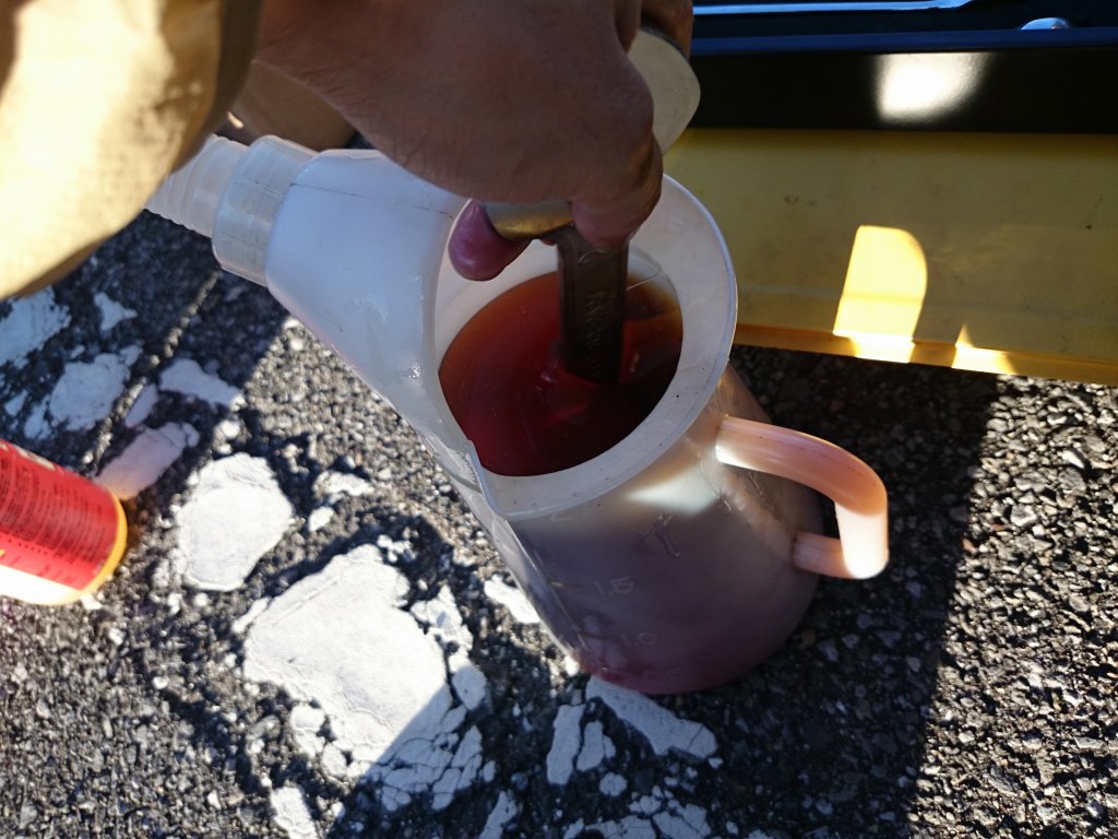 ドレンボルトを外したら、800kmしか走っていないとは思えないほど真っ黒なオイルが流れてきました。しばらくこのまま放置してオイルを抜き、その間にオイルの調合を実施します。
