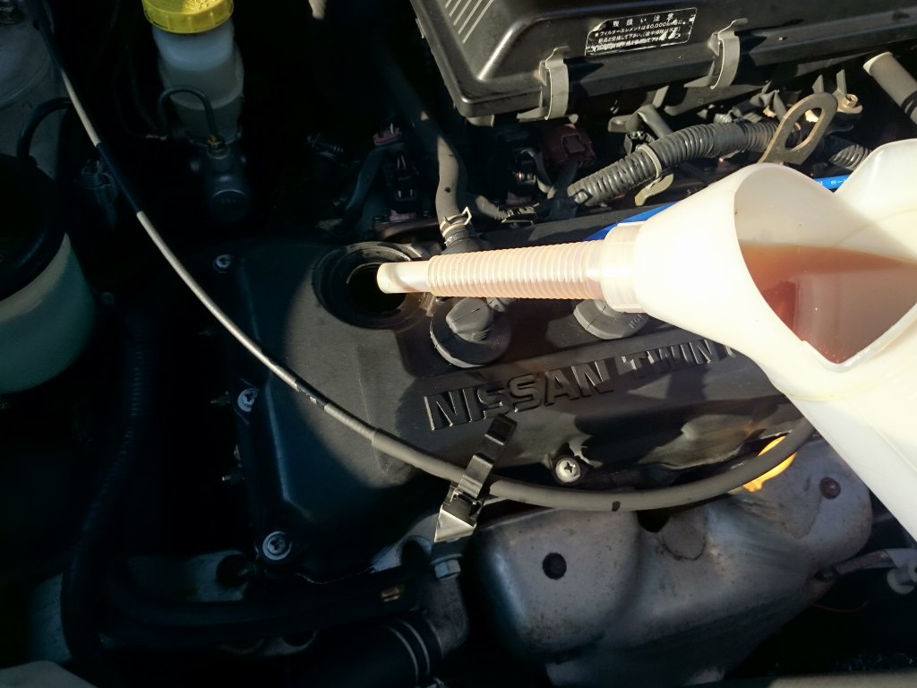 まずエンジンオイルをじょうごの中に入れます。